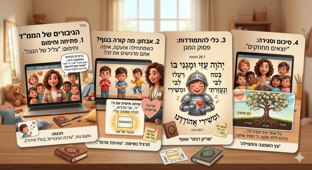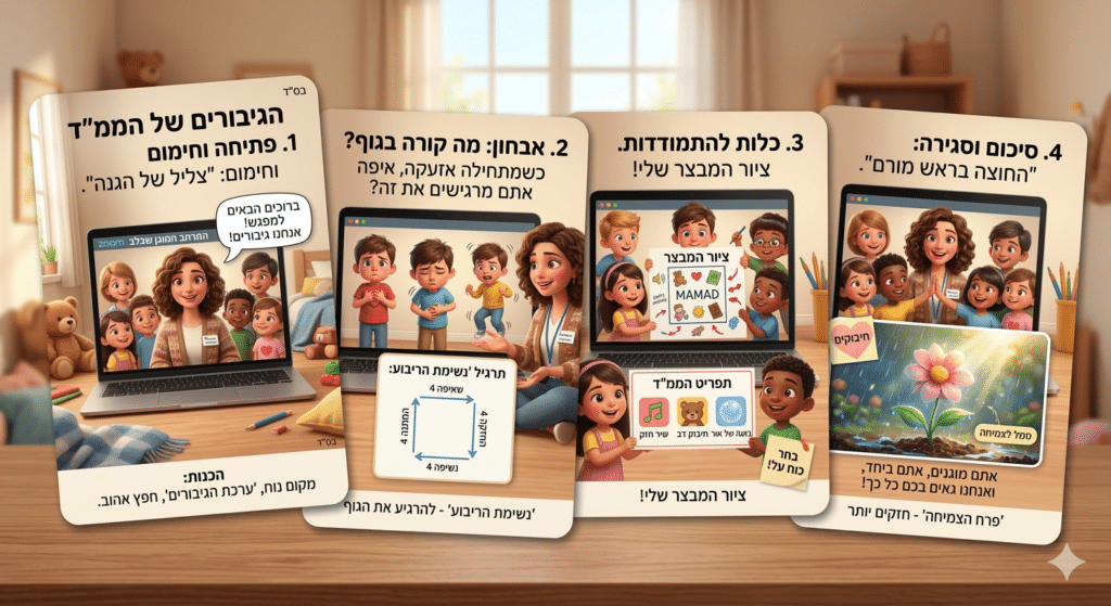 * מבנה המפגש (כ-45 דקות): פתיחה מרגיעה, עבודה עם "מפת רגשות", תרגילי נשימה ומשימות הפגה לממ"ד.