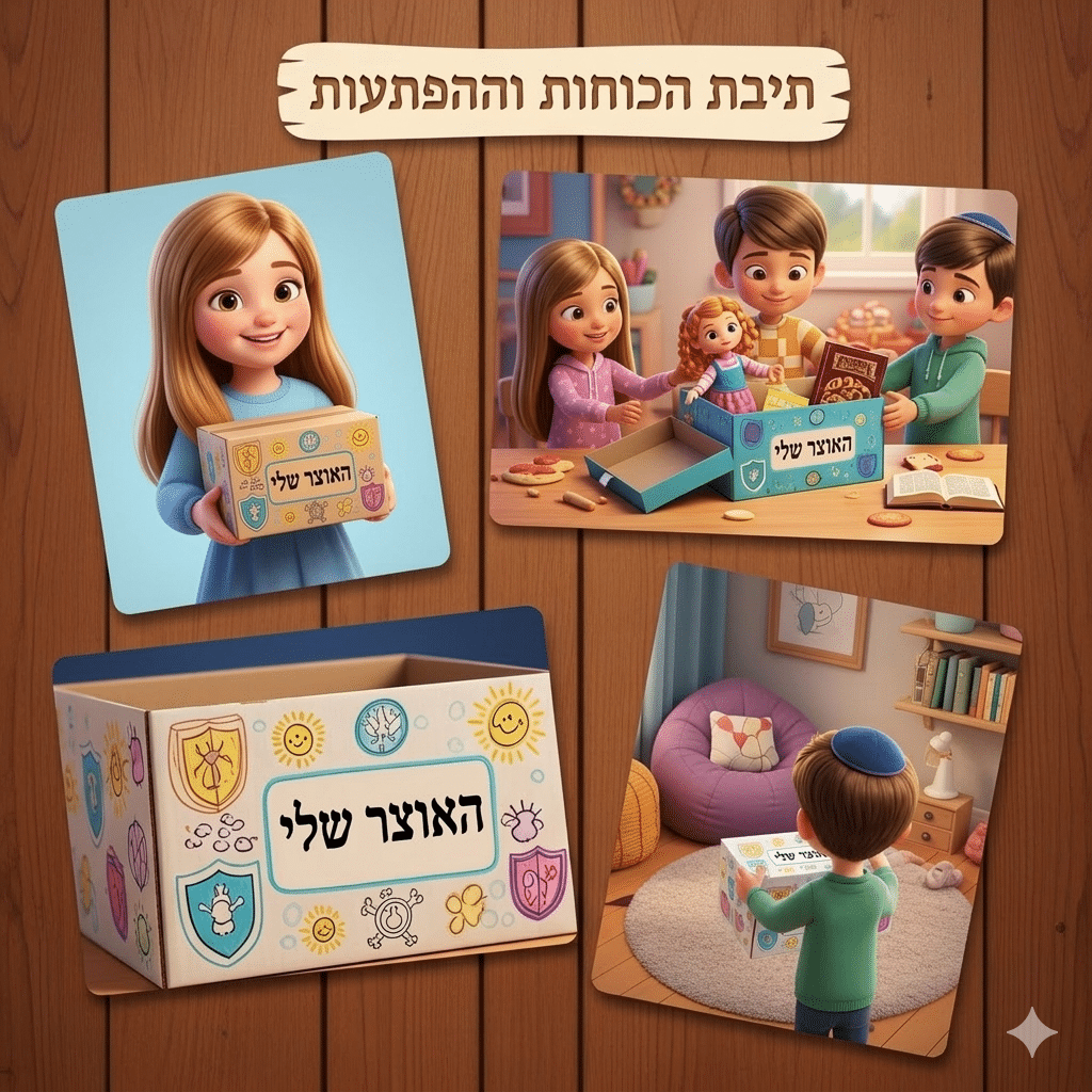 * המשימה: "מצאו בבית קופסת נעליים או סלסלה. קשטו אותה מבחוץ בציורים של הגנה ואור. כתבו עליה בגדול: 'התיבה של [השם שלי] – ה' איתי!'."