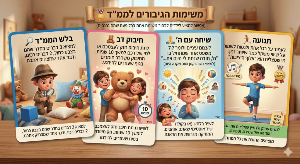 "משימות הפגה" קצרות וממוקדות, שמשלבות תנועה, מחשבה, אמונה וקצת צחוק. אלו משימות שנועדו להחזיר לילדים את תחושת השליטה בזמן ההמתנה בממ"ד.