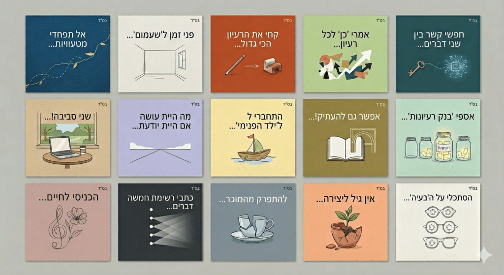 אִסְפִי בַּנְק רַעְיוֹנוֹת… כִּי בַּחִלּוּף נִמְצָאת הַהַגְשָׁמָה הַמְּדֻקְדֶּקֶת שֶׁל הַיְּצִירָה הַפְּנִימִית.