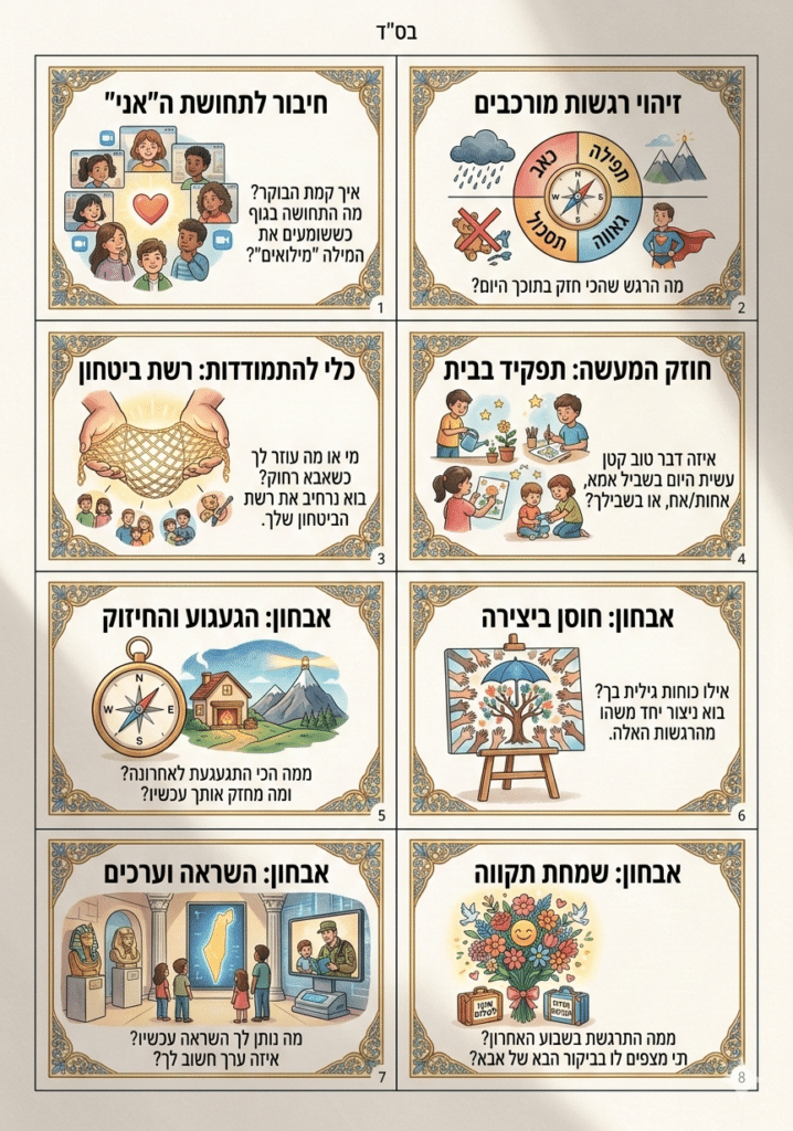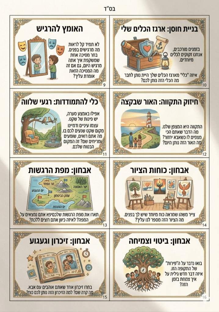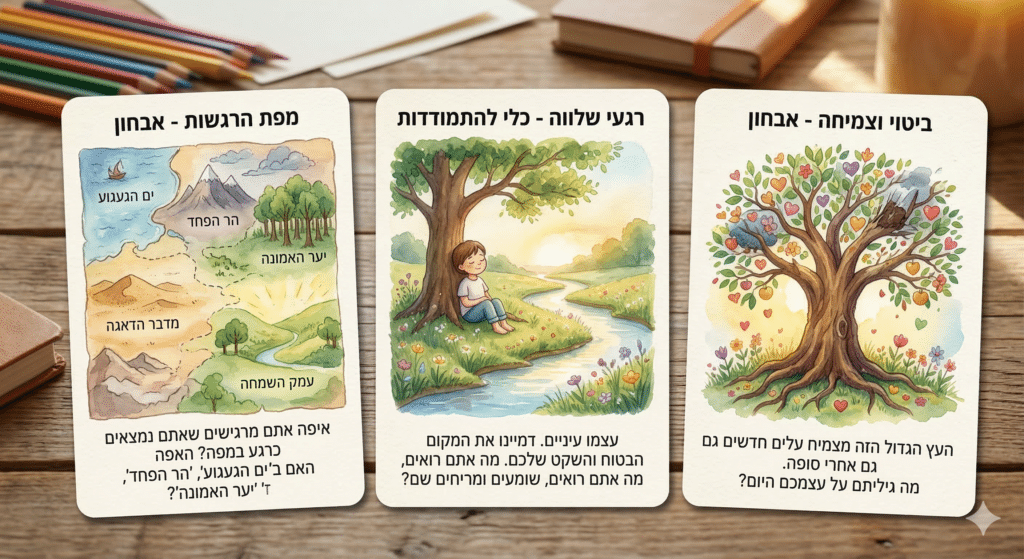 אנחנו הולכים להשתמש בקלפים המיוחדים שלנו. הקלפים האלה הם כמו מפתח – הם עוזרים לנו לפתוח דלת לתוך הלב, לגלות שם כוחות נפלאים, ולדבר עם הקב"ה על מה שמפחיד או מעציב. יחד נהפוך את הרגשות לחברים טובים שיעזרו לנו להיות חזקים ומאמינים יותר.