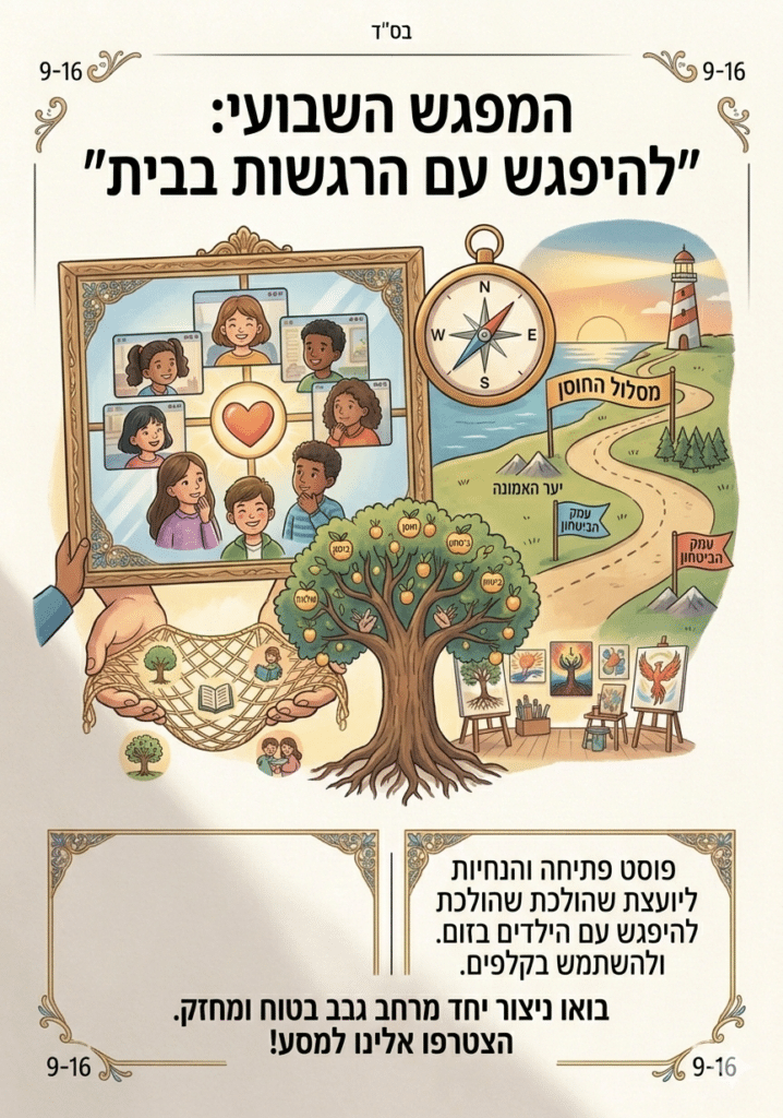 * הקראת הפוסט: קראי את הפוסט שכתבת (בצורה מותאמת לגיל). הדגישי את הנקודות המרכזיות: "מקום בטוח", "מפתח ללב", "אין תשובות נכונות".