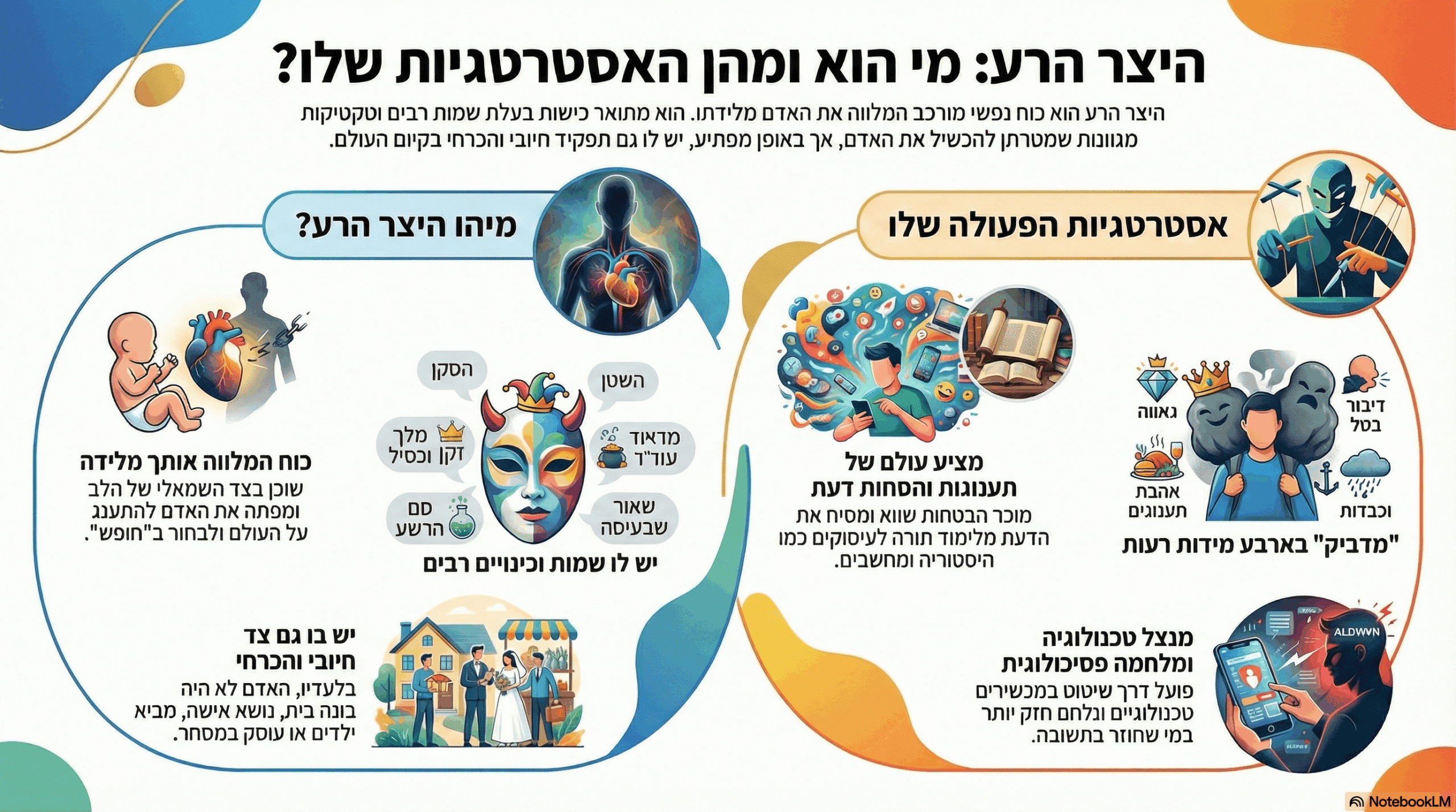מִיהוּ וּמָהוּ הַיֵּצֶר הָרַע?/הגאון רבי בן ציון מוצפי הַיֵּצֶר הָרַע הוּא כֹּחַ נַפְשִׁי, מַלְאָכִי וְגַם חֵלֶק מֵעֲבוֹדָתוֹ שֶׁל הָאָדָם, הַמְּלַוֶּוה אוֹתוֹ מִיּוֹם לֵידָתוֹ: הַתּוֹרָה כָּתְבָה "וַיִּיצֶר" בִּשְׁנֵי יוּדִין לְרַמֵּז