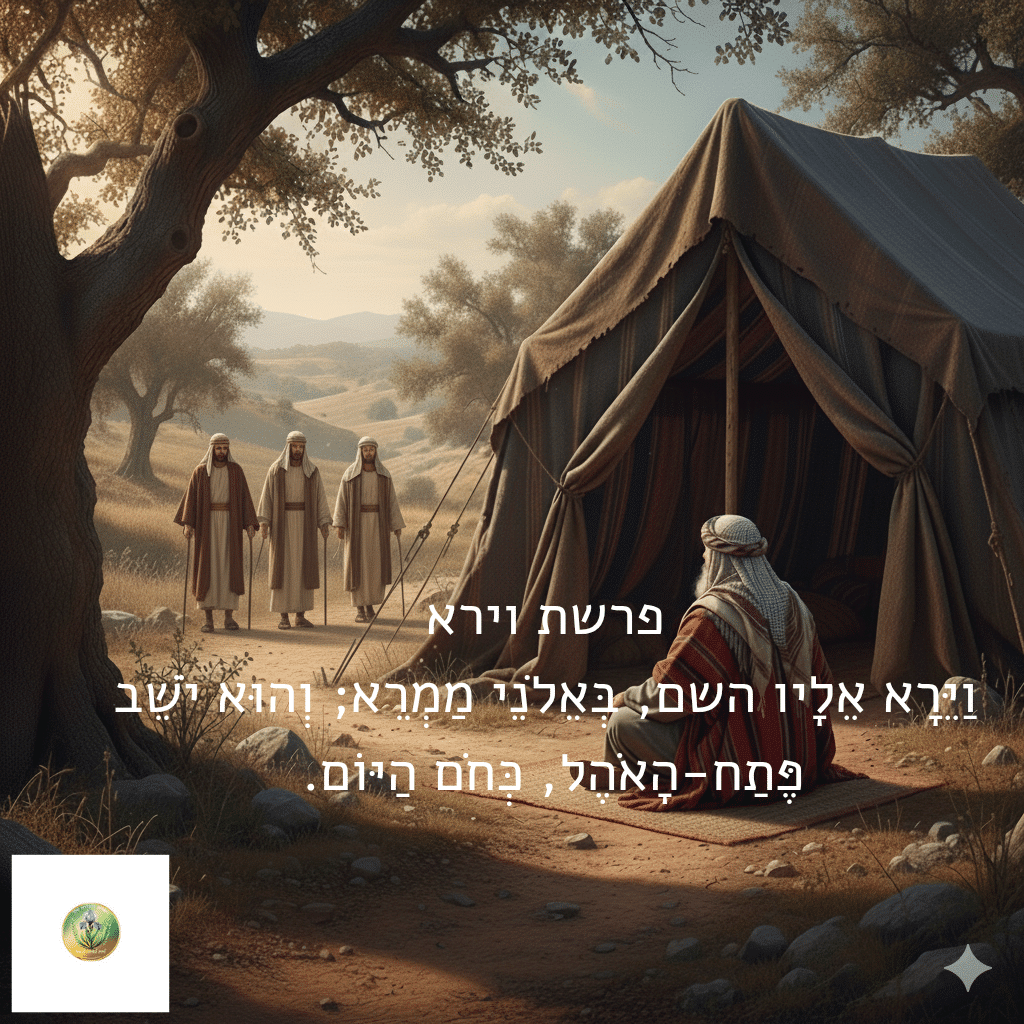פרשת וירא וַיֵּרָא אֵלָיו השם, בְּאֵלֹנֵי מַמְרֵא; וְהוּא יֹשֵׁב פֶּתַח-הָאֹהֶל, כְּחֹם הַיּוֹם. ב וַיִּשָּׂא עֵינָיו, וַיַּרְא, וְהִנֵּה שְׁלֹשָׁה אֲנָשִׁים, נִצָּבִים עָלָיו; וַיַּרְא, וַיָּרָץ לִקְרָאתָם מִפֶּתַח הָאֹהֶל, וַיִּשְׁתַּחוּ, אָרְצָה. ג וַיֹּאמַר:
