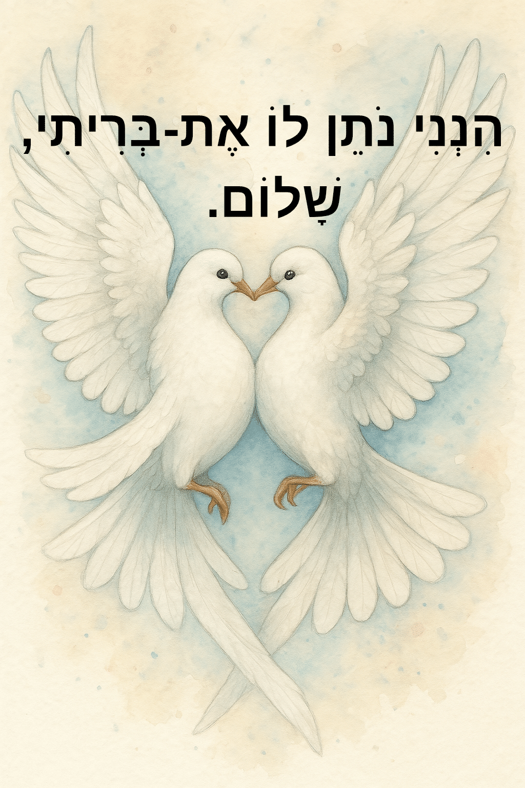 פרשת פנחס וַיְדַבֵּר השם, אֶל-מֹשֶׁה לֵּאמֹר. יא פִּינְחָס בֶּן-אֶלְעָזָר בֶּן-אַהֲרֹן הַכֹּהֵן, הֵשִׁיב אֶת-חֲמָתִי מֵעַל בְּנֵי-יִשְׂרָאֵל, בְּקַנְאוֹ אֶת-קִנְאָתִי, בְּתוֹכָם; וְלֹא-כִלִּיתִי אֶת-בְּנֵי-יִשְׂרָאֵל, בְּקִנְאָתִי. יב לָכֵן, אֱמֹר: הִנְנִי נֹתֵן לוֹ אֶת-בְּרִיתִי, שָׁלוֹם. יג